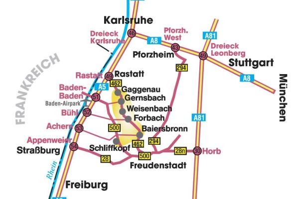 - A5 Karlsruhe-Basel bis Ausfahrt Rastatt-Nord. Weiter auf der B462 in Richtung Freudenstadt bis nach Baiersbronn.